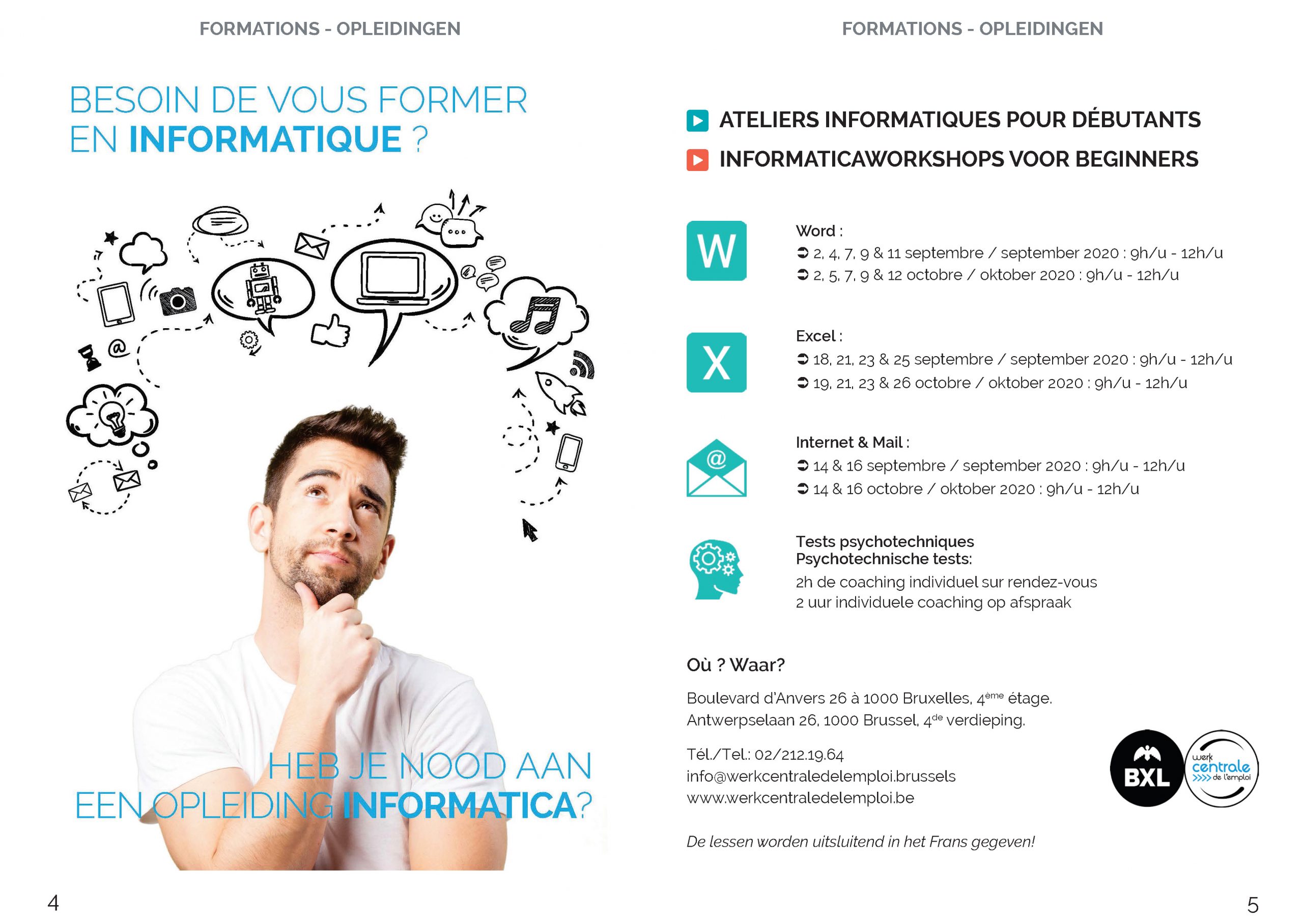 Tous les après-midi de 13h30 à 16h00 au boulevard d’Anvers, 26 à 1000 Bruxelles au 4ème étage.