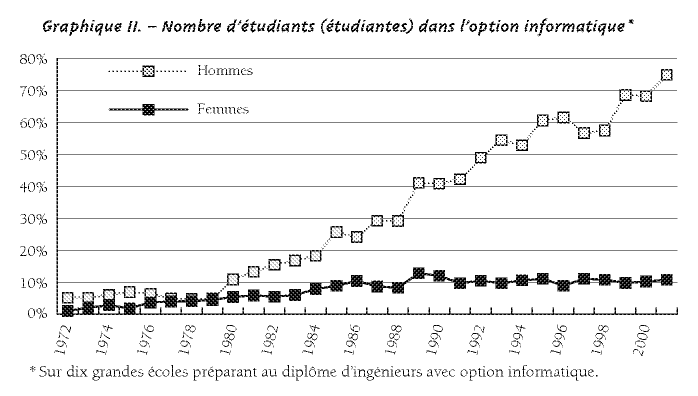 L’informatique est une affaire d’hommes ? Pas si sûr ! Si l’informatique n’est pas nécessairement une exclusivité masculine, force est de constater que depuis les années 80, ce sont les hommes qui se sont massivement engagés dans ce secteur. Ce phénomène est bien visible sur le graphique suivant, issu d’une recherche d’Isabelle Collet intitulée : « La disparition des filles dans les études d’informatique : les conséquences d’un changement de représentation ». Nous pouvons constater que la participation des femmes dans les études d’ingénieur, option informatique, semble stagner dans nos contrées à hauteur d’un peu plus de 10% des effectifs depuis le milieu des années 80.